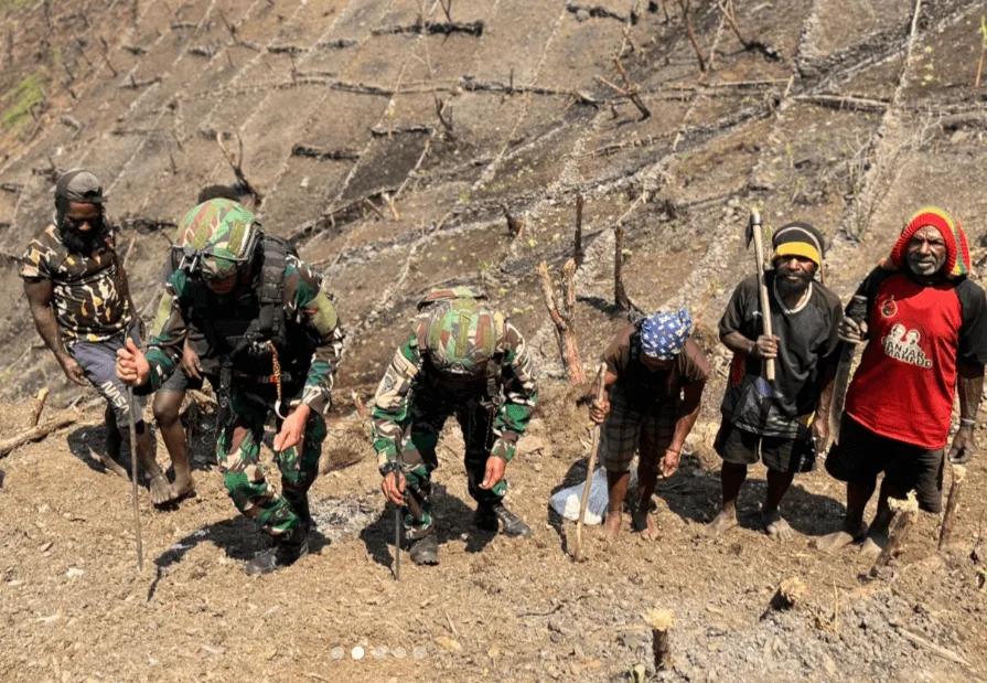 Di bawah pimpinan Danpos Merah Putih, Letda Inf Danuja, personel Satgas membantu warga menanam berbagai bibit, mulai dari ubi hingga sayuran. Kehadiran TNI tidak hanya meringankan tenaga masyarakat dalam membuka lahan, tetapi juga memberi semangat baru untuk lebih mandiri dalam mencukupi kebutuhan pangan.